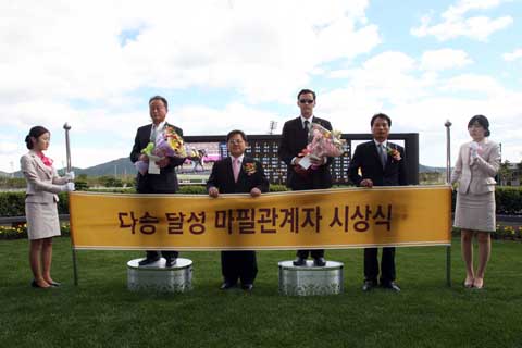 KRA부산경남경마공원(본부장 조정기)은 5월 29일(일) 4경주 종료 후 관람대 저면 시상대에서 김병학(51세), 울즐리(48세) 조교사에 대한 100승 시상식을 개최하였다. 김병학, 울즐리 조교사는 지난 5월 6일(금) ‘최강유코’, ‘킹오스틴’ 각각의 경주마가 우승을 하면서 100승을 달성하였다. 김병학은 2004년에 조교사로 데뷔하여 통산경주 성적은 1,596전 100승으로 6.3% 승률을 보이고 있고, 2007년에 데뷔한 울즐리 조교사는 613전 100승으로 16.5%의 승률을 기록하고 있다.