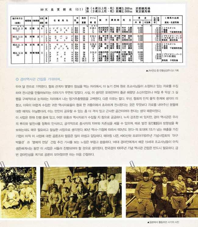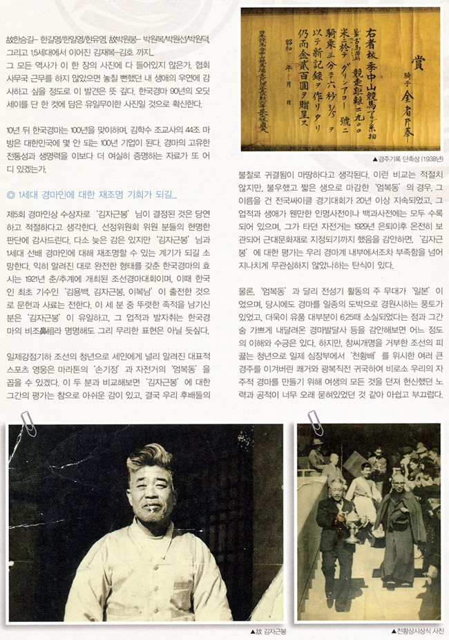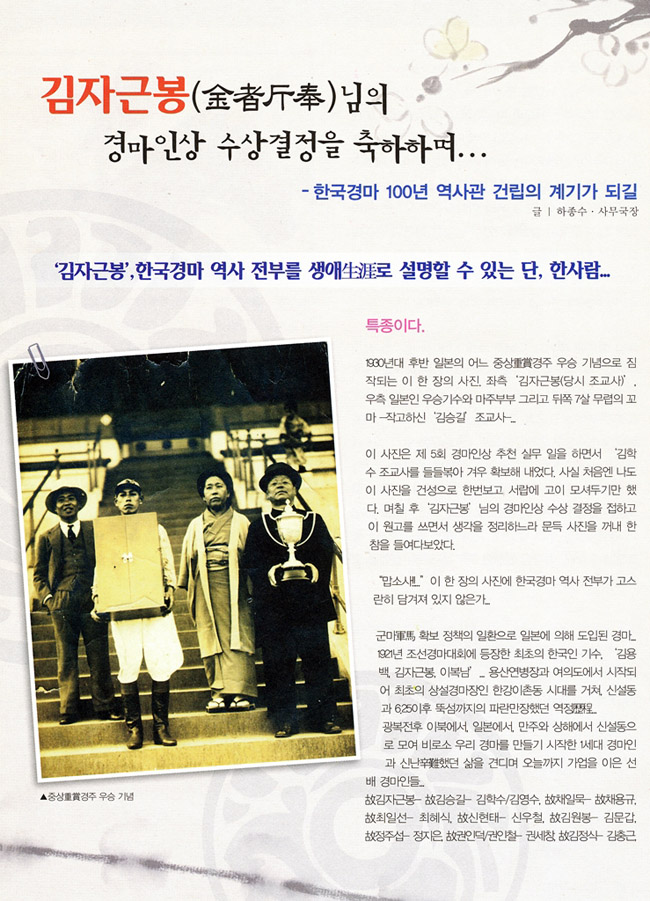 조교사협회 하종수 사무국장의 조교사협회 사보<고삐> 기고문 "김자근봉(金者斤奉)님의 경마인상 수상을 축하하며..." 전문발췌