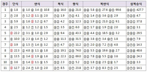총 11개 경주가 펼쳐진 이 날, 게이트 2번 경주마가 무려 8개 경주에서 입상했다.