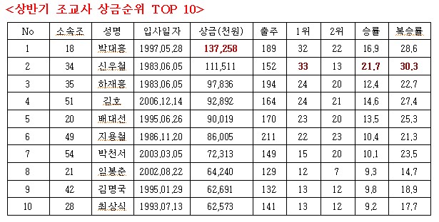 - 조경호 기수, 박대흥 조교사, 경주마 ‘광야제일’ 부문별 상금랭킹 1위