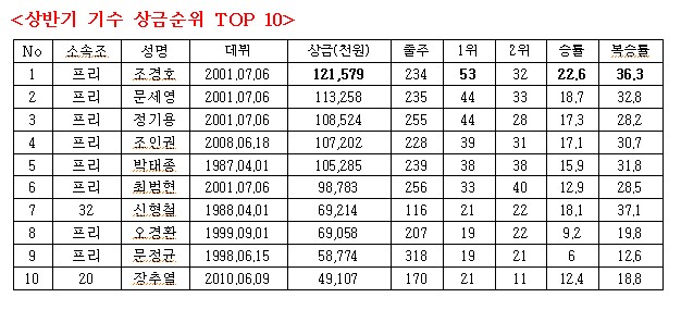 상반기 기수부문은 2010년에 이어 조경호, 문세영 기수의 다승왕 경쟁이 그대로 이어지는 분위기다. 2010년 다승왕인 조경호 기수는 상반기에 243회 경주에 출전해 우승 53회, 2위 32회(승률 22.6%)를 기록하면서 다승과 상금부문에서 모두 1위를 차지하였고, 그 뒤를 문세영 기수가 235회 경주 출주에 우승 44회, 2위 33회(승률 18.7%)를 기록하면서 바짝 추격하는 모양새다. 이 두명의 기수 이외에 올 상반기 최고로 돋보이는 기수는 정기용 기수이다. 연초부터 무서운 상승세를 보이며 다승왕 경쟁에 합류한 정기용 기수는 255회 경주에 출주하여 우승 44회, 2위 28회(승률 173.%)를 기록하며 다승 공동 2위, 상금 3위를 달리고 있다. 그 뒤를 젊은 기수의 선두주자 조인권 기수가 39승으로 4위, 경마 대통령 박태종 기수가 38승으로 5위를 달리면서 다승왕타이틀을 가시권 내에서 호시탐탐 노리고 있다.