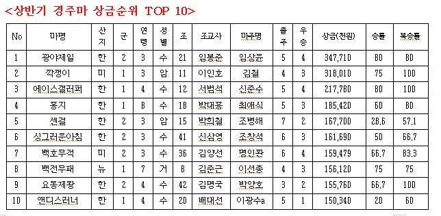 상반기에 가장 눈에 띄는 활약을 펼친 경주마는 ‘광야제일’과 ‘깍쟁이’였다. 상반기 상금랭킹 1위를 차지한 국산 3세 경주마 ‘광야제일’은 코리안더비(GⅠ) 우승을 포함하여 출주한 5번의 경주에서 4번이나 우승을 차지하면서 80%의 높은 승률을 기록하였다. 상금랭킹 2위를 차지한 미국산 3세 경주마인 ‘깍쟁이’는 서울마주협회장배(GⅢ)와 세계일보(L) 대상경주에서 우승하는 등 출주한 4번의 경주에서 3번을 우승하면서 75%의 승률과 100%의 복승률을 기록했다. 이밖에 인상적인 활약을 펼친 경주마로는 조경호기수와 찰떡궁합을 보이며 상반기에만 4승을 챙긴 ‘에이스갤러퍼’와 노장투혼을 발휘하며 3승을 거둔 ‘홍지’도 알찬 상반기를 보냈다.