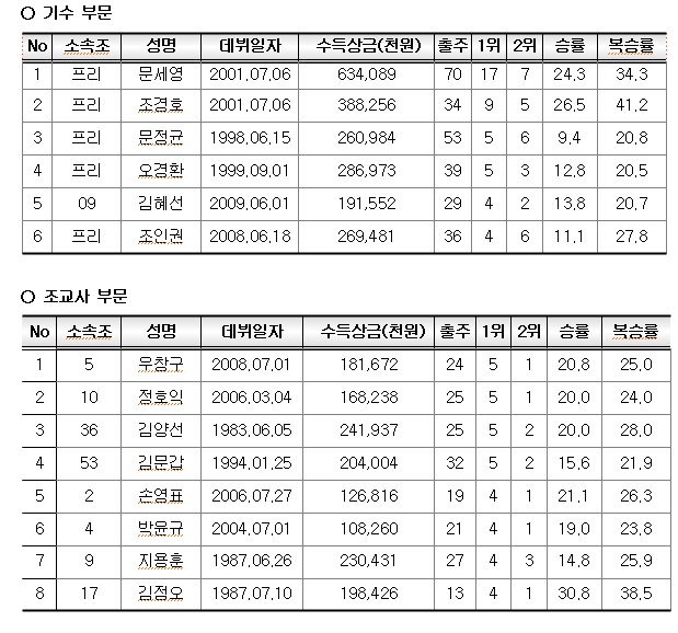 ‘경주로의 총감독’이라고 할 수 있는 조교사의 야간경마 성적을 살펴보면 1위부터 4위까지의 승차가 없을 정도로 치열한 경쟁을 보여줬다. 이번 야간 경마기간 동안 활약을 보인 조교사는 우창구조교사(5조)이다. 5조의 우창구조교사는 24두의 소속마필을 경주에 내보내 5승 2위 1회 복승률 25% 기록하며 최고의 자리에 올랐다.