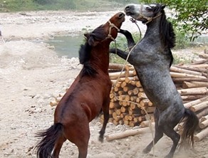말은 습성, 본능에서 나오는 여러가지 버릇이 있습니다. 움직이지 않는 버릇은 마방을 떠나기 싫어하거나 동료나 다른 곳으로 부터 움직이지 않으려는 버릇인데요. 말은 코끝을 쓰다듬을 때 무는 행동을 합니다. 또 돌출되어 있는 곳을 물고 입으로 공기를 빨아들이는 행동도 합니다. 그리고 마방 문앞에 서서 규칙적으로 몸을 좌우로 흔드는 행동, 마방 바닥을 앞발로 긁어서 파는 버릇도 있는데요. 가장 흔한 행동으로는 몸이 불편하거나 상대방에게 위협을 줄때 일어서는 버릇이 있습니다.