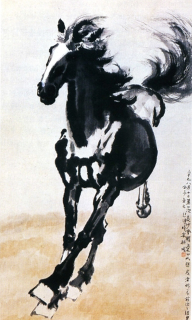 무게감 있고, 활동성 있는 그림 속의 마른 서비홍의 작품입니다. 휘날리는 갈퀴와 천지를 흔들거 같은 말발굽 소리가 지금도 들릴 것 같은 분마도는 서비홍의 대표작 중 하나입니다. 서비홍은 중국의 현대 회화가로 네 살 때부터 아버지에게 그림을 배웠고, 일본과 프랑스에 유학을 다녀온 실력파 화가입니다. 그리고 그는 거기서 배움을 멈추지 않고 베를린 미술학원을 다니며 그림에 대한 열정을 불태웠습니다. 서비홍은 말에 대한 애착이 상당히 강한 인물로 말을 겉으로 보는 것에서 그치지 않았습니다.