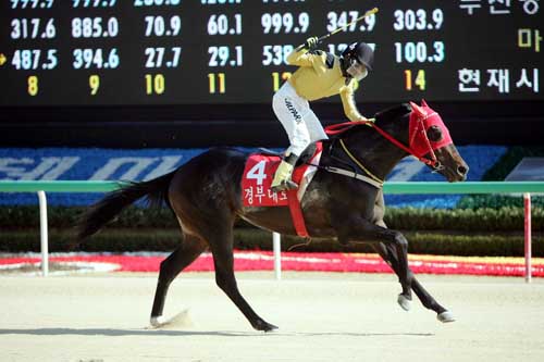 2012년도 최고의 국내산마를 가리는 ‘삼관마 시리즈’. 그 첫 관문인 KRA컵 마일(GIII) 대상경주(국1, 1600m, 총상금 5억 원, 4월 8일 시행)에서 부경경마공원 소속 ‘경부대로’가 역전우승을 일궈내면서 삼관을 향한 첫 항해를 순조롭게 마쳤다.
