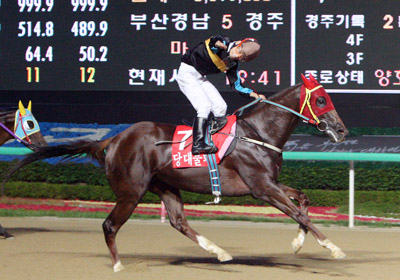 경주는 4코너를 지나면서 더욱 흥미진진해졌다. ‘터프윈’은 경주로 외곽에서, ‘스마티문학’은 경주로 인코스를 고집하면서 선두로 달리던 ‘당대불패’를 무섭게 추격했다. 직선주로에 접어들면서 ‘당대불패’는 경주로 중앙에 위치하며 선구 굳히기에 들어갔고 후속하던 ‘스마티문학’이 막판 무서운 기세로 뒤를 쫒았다. 하지만 선행 작전에도 불구하고 끝까지 지치지 않는 체력을 보여준 ‘당대불패’가 ‘스마티문학’을 2마신차로 따돌리고 안방에서 국내산마의 자존심을 지켜냈다.