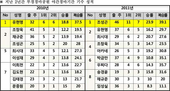부경경마공원이 발표한 자료에 따르면 2010년과 2011년, 야간경마기간 부경경마공원 기수들 중 가장 눈부신 활약을 보인 기수가 누구인지 알 수 있다. 우선 2010년도 시즌을 살펴보면 야간경마 기간 중 유현명 기수가 6승을 기록해 기수들 중 가장 많은 승리를 기록했다. 다음으로 조성곤 기수와 조창욱, 채규준 기수도 5승으로 공동 2위에 이름을 올렸다.