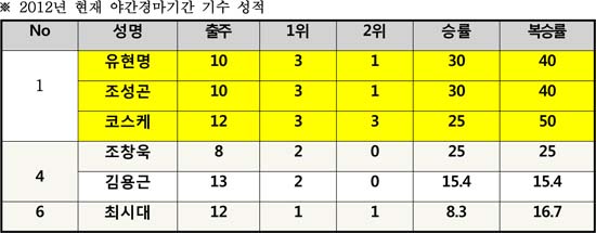 그렇다면 2012년도 부경경마공원 기수들의 성적은 어떨까? 발표된 자료를 살펴보면 이미 야간경마기간 중 한주를 흘려보낸 현재 지난 2년의 데이터와 비슷한 양상을 보이고 있다. 조성곤 기수와 유현명 기수, 일본 출신의 코스케 기수가 한 주간의 야간경마 기간 중 나란히 3승씩을 기록해 공동 선두에 이름을 올리고 있는 것. 조성곤 기수와 유현명 기수는 이미 2년간의 기록에서 알 수 있듯 야간경마에 여전히 강한 면모를 보이고 있는 것이다. 공동으로 선두에 이름을 올린 코스케 기수는 한국무대에서 맞이하는 첫 번째 야간경마지만 완벽한 적응력을 보이면서 지난 2년간 부경의 야간경마를 휩쓸었던 두 명의 기수와 어깨를 나란히 했다.