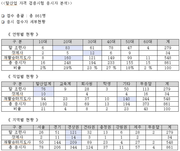 응시자를 직업군별로 보면 말(馬)관련 종사자가 21%로 가장 높은 비중을 차지했다. 다음으로 회사원 8%, 교육계 4% 등을 기록했으며 특정한 직업을 갖지 않은 학생 등 일반인 비중도 25%에 달했다. 연령 별로는 20대가 29%로 응시율이 가장 높았고 특히, 재활승마지도사와 말조련사를 선호하는 것으로 나타났다. 40대가 27%, 30대가 23%로 뒤를 이었다. 지역별로는 경상도가 344명이 지원해 최다인원을 기록했고 다음으로 서울·경기도가 284명, 전라도가 124명으로 많았다. 제주도의 응시자는 57명으로 말생산 본고장이라는 지역 위상에 걸맞지 않게 지역별 분류에서 최하위를 기록했다.