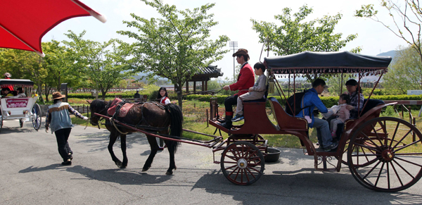 한편 이번 경마공원의 어린이날 행사에서는 주목할 만한 변화가 있었다. 경마공원의 행사의 질적 변화로 볼 수 있는 ‘특정 서비스의 유료화’ 정책으로 탄생한 「호스아일랜드 3색체험」이 그것이다. ‘호스아일랜드 3색체험’은 부경경마공원 경주로 안쪽에 위치한 인공호수의 특성을 살린 체험행사이다. 꽃마차와 21인승 대형 전기자동차, 이색바이크 이렇게 세 가지 상품을 조합해 ‘3색 체험’이라고 명명된 이 체험행사는 유료서비스로 지난 어린이날에 맞춰 런칭했다. 꽃마차와 전기자동차 체험은 성인 2천원, 어린이 1천원으로 이용 가능하며 이색바이크는 대당 2천원에 대여가 가능하도록 책정했다. 어린이날 행사진행 결과 4일과 5일, 양일에 걸쳐 3색체험을 즐긴 인원은 총 5천 명이었다. 워낙 인기 있는 상품이었기에 이용객들이 몰리면서 정오가 채 되기도 전에 표가 매진될 정도였다.