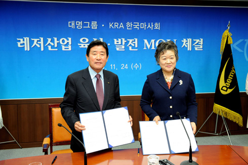 KRA 한국마사회(회장 김광원)가 24일 서울경마공원 대회의실에서 대명그룹과 레저산업 육성 MOU(양해각서)를 체결했다. 체결식에는 김광원 한국마사회 회장과 박춘희 대명그룹 회장 등 양사 관계자 20여 명이 참석했다.
