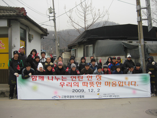 (사)한국경마기수협회는 ‘(사)따뜻한 한반도 사랑의 연탄 나눔 운동’과 공동으로 ‘10.12. 1(수) 에 서울 중랑구 신내동에서 독거노인과 저소득층 가정을 대상으로 사랑의 연탄 나누기 행사를 실시합니다. 이날 행사에는 기수 40여명이 참석하여 10가구에 연탄 3,000장과 쌀을 전달할 예정입니다. 이번 행사에 쓰이는 쌀은 농협중앙회장배 대상경주에 우승한 조경호 기수가 기증하였습니다.