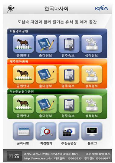 KRA의 스마트폰 서비스는 안드로이드용과 기타 기종(아이폰 포함)용 2가지로 개발되었으며 출마정보, 경주속보, 성적정보 등의 경마정보와 교통안내, 공원서비스 등 공원정보를 편리하게 이용할 수 있다. 뿐만아니라 KRA 주요 공지사항, 지점찾기, 홍보동영상, KRA 블로그 등 다양한 정보와 서비스도 이용할 수 있다. 특히, 스마트폰의 위치정보를 이용하여 가까운 지점을 찾을 수 있는 기능은 스마트폰의 기능을 제대로 살린 기능으로 평가받고 있다.